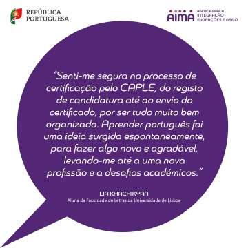 “Senti-me segura no processo de certificação pelo CAPLE, do registo de candidatura até ao envio do certificado, por ser tudo muito bem organizado. Aprender português foi uma ideia surgida espontaneamente, para fazer algo novo e agradável, levando-me até a uma nova profissão e a desafios académicos.”