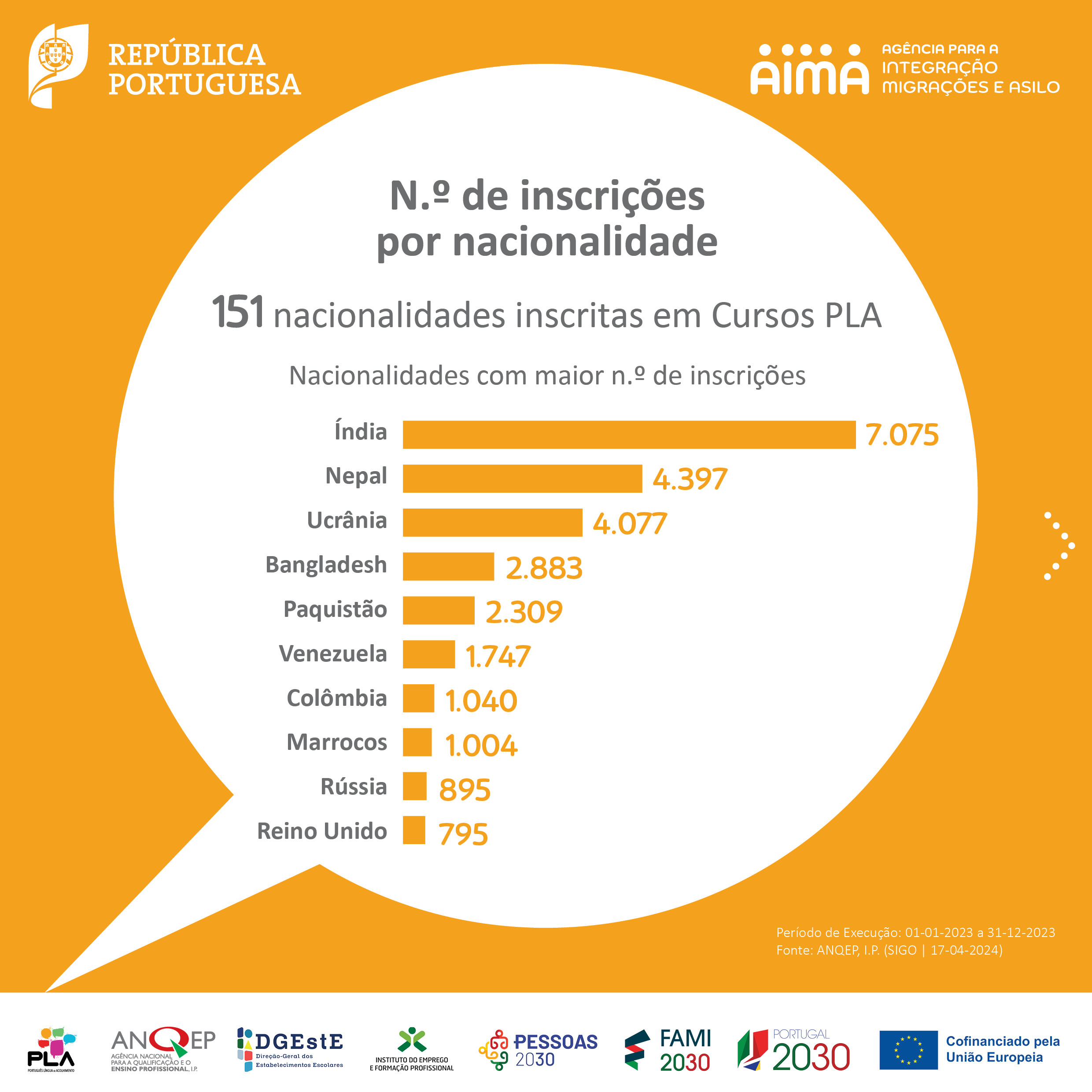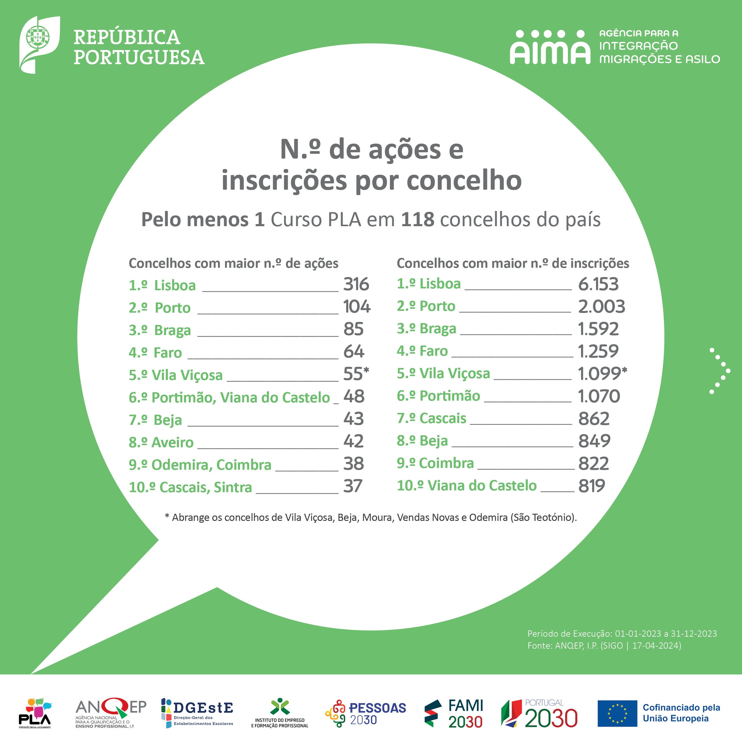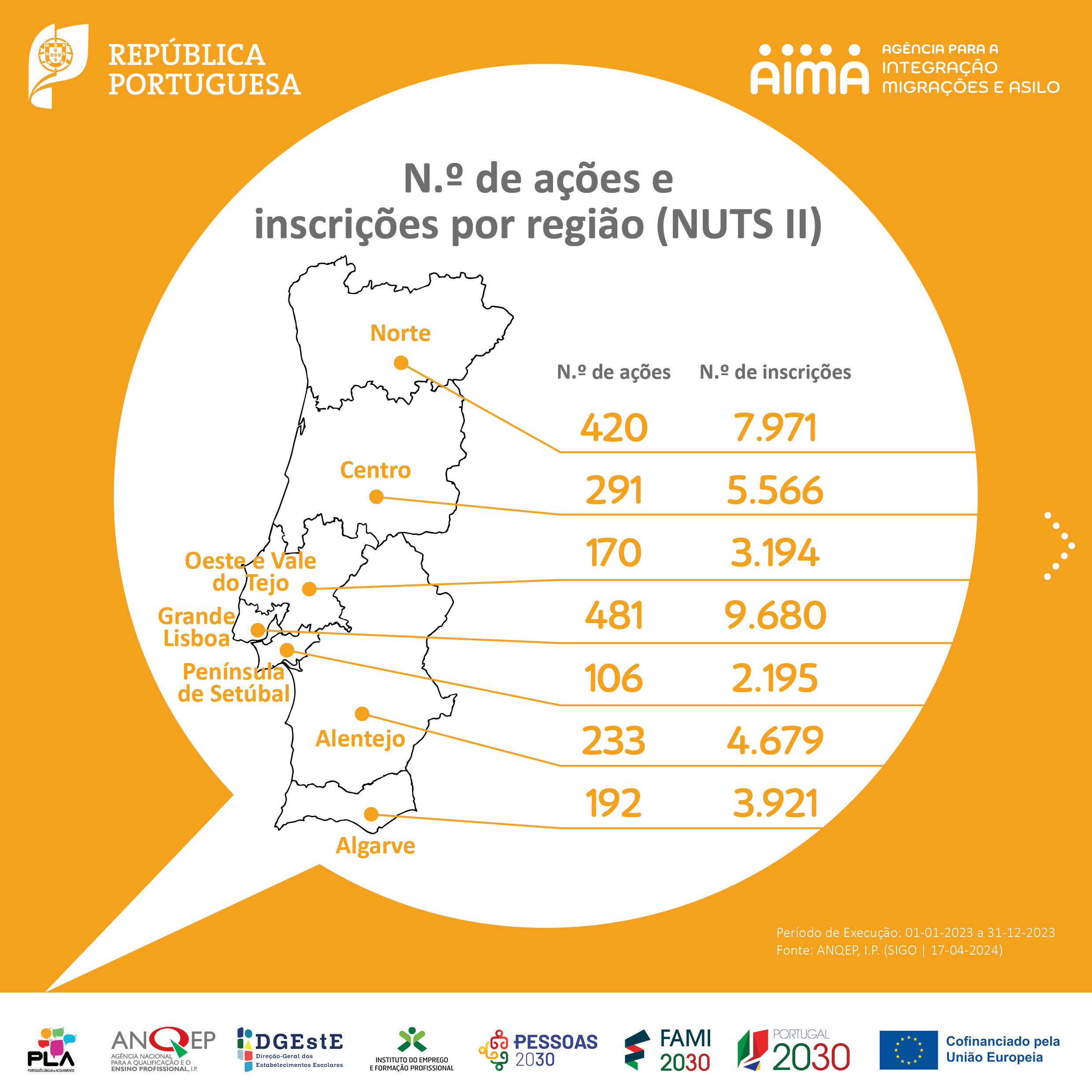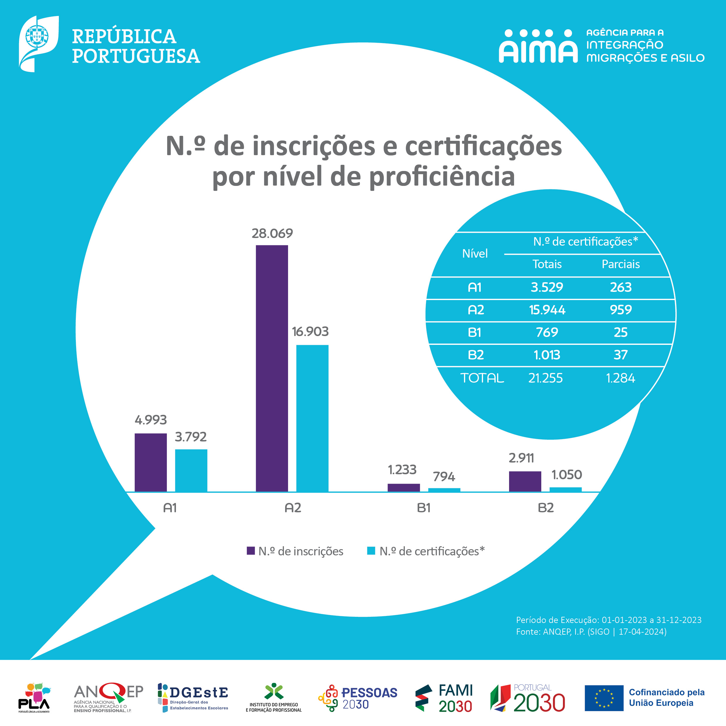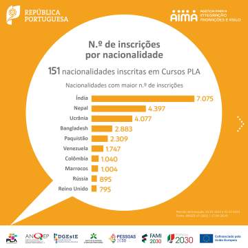 No seguimento das comemorações do Dia Mundial da Língua Portuguesa, 5 de maio, partilhamos a infografia sobre os cursos de Português Língua de Acolhimento (PLA) com o balanço da execução referente ao ano de 2023, produzida no âmbito do Grupo de Trabalho PLA. Os cursos PLA visam responder às necessidades de aprendizagem da língua portuguesa junto de pessoas migrantes em Portugal.