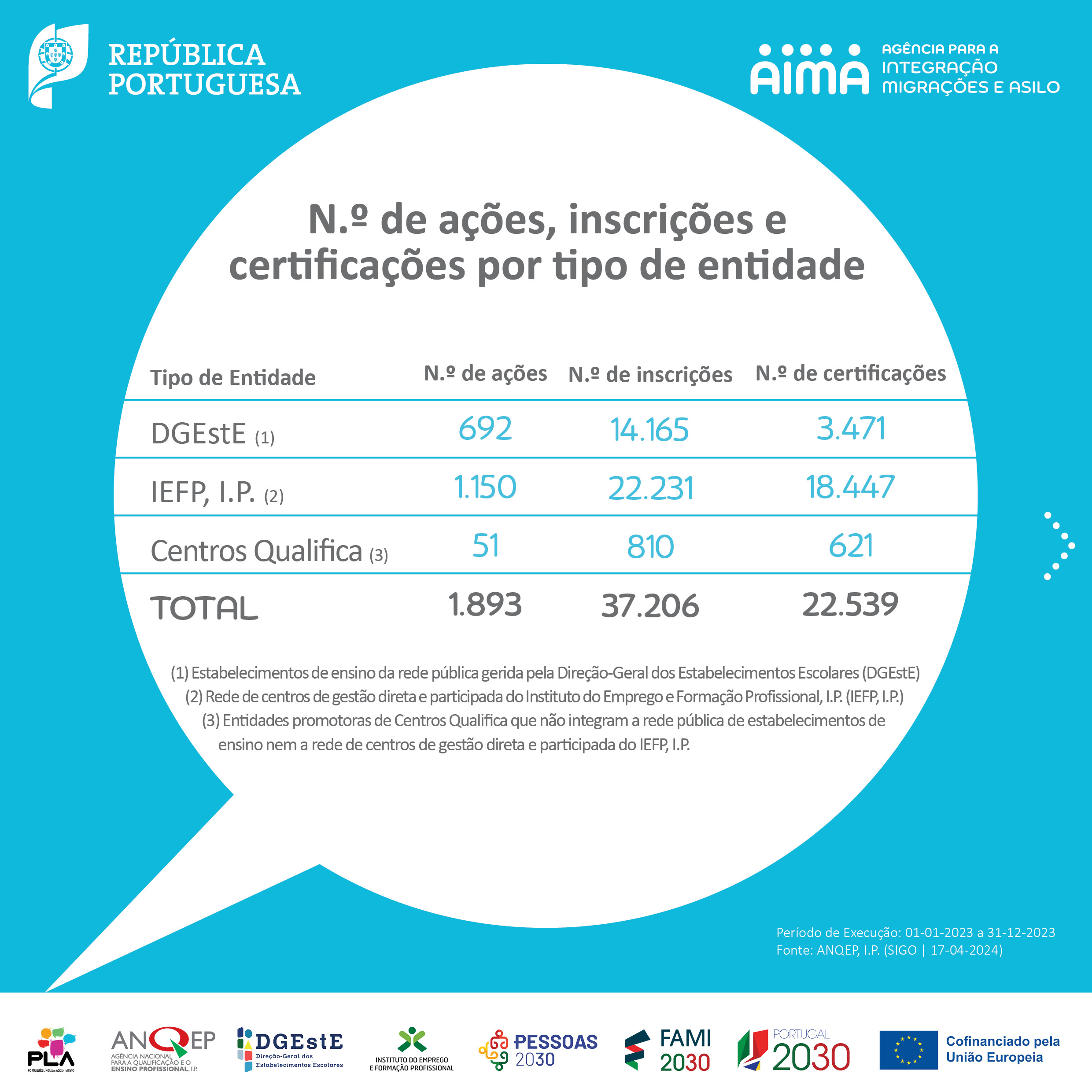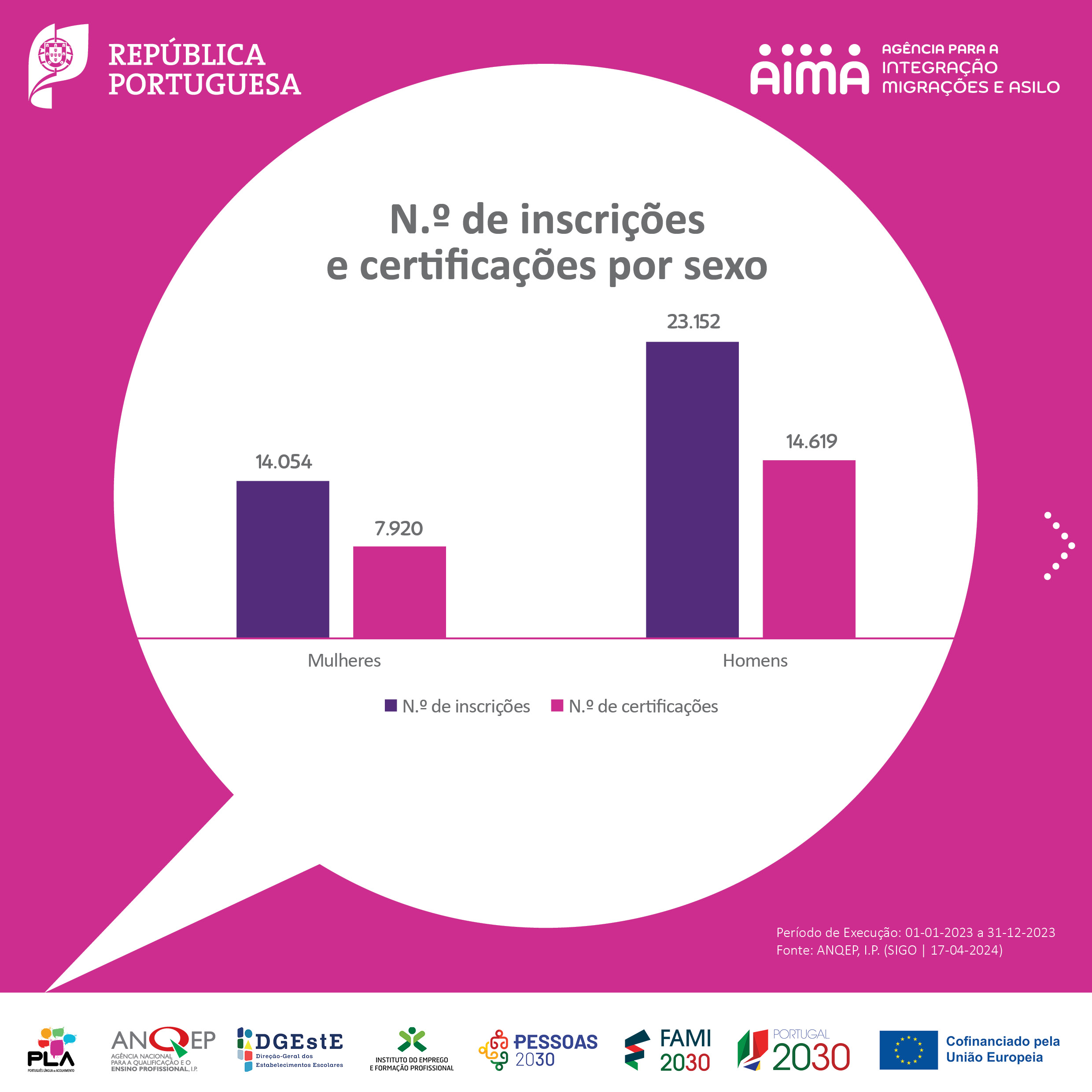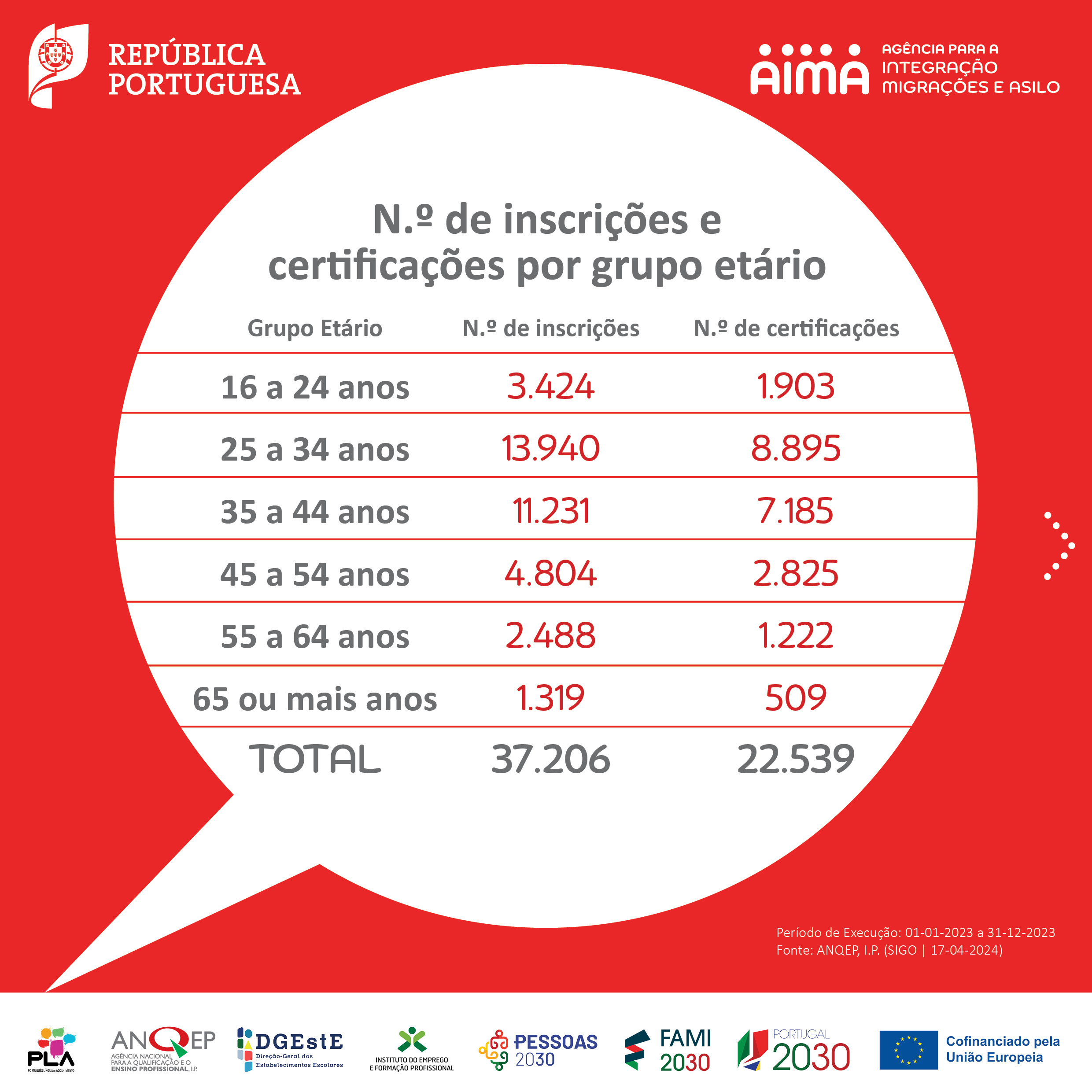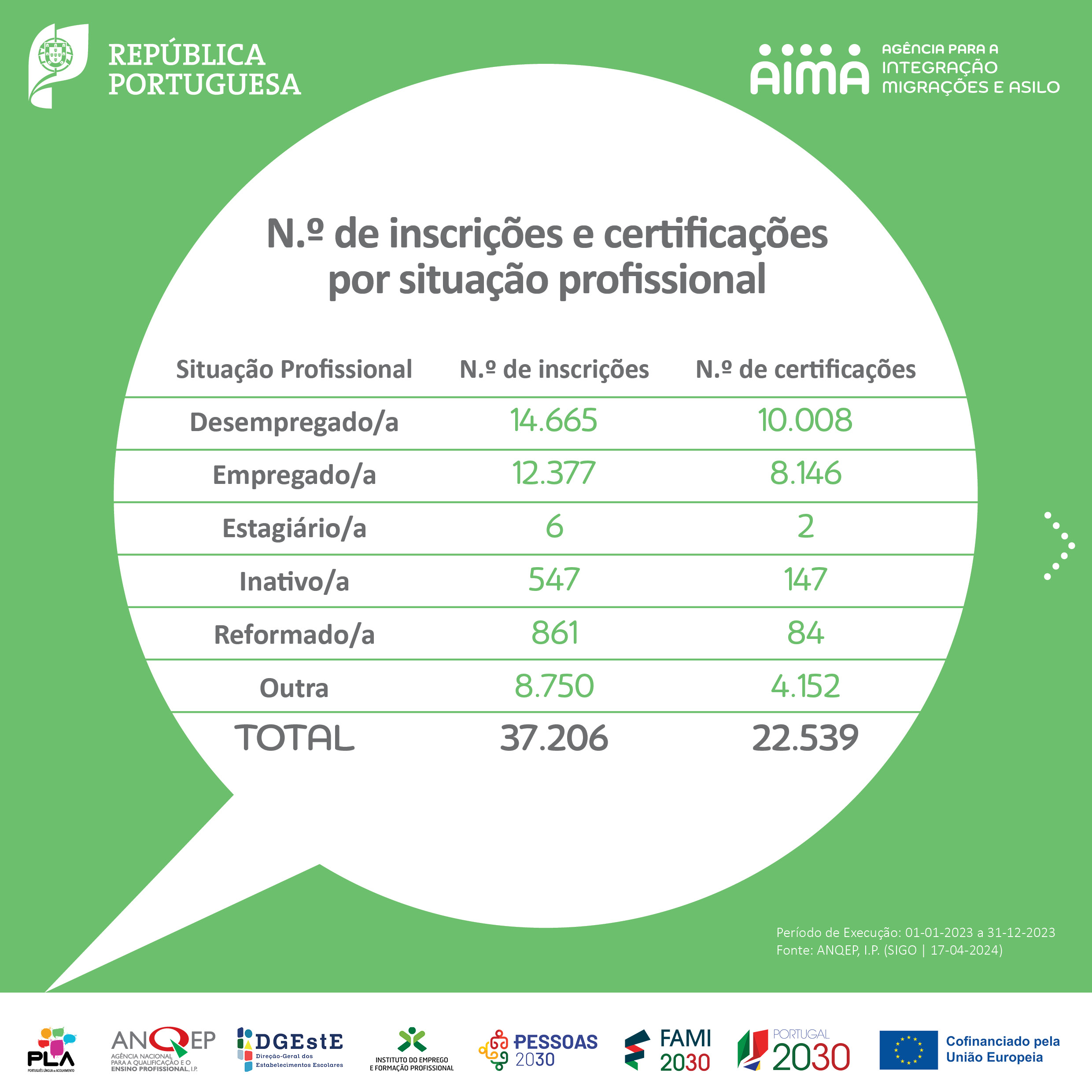 No seguimento das comemorações do Dia Mundial da Língua Portuguesa, 5 de maio, partilhamos a infografia sobre os cursos de Português Língua de Acolhimento (PLA) com o balanço da execução referente ao ano de 2023, produzida no âmbito do Grupo de Trabalho PLA. Os cursos PLA visam responder às necessidades de aprendizagem da língua portuguesa junto de pessoas migrantes em Portugal.